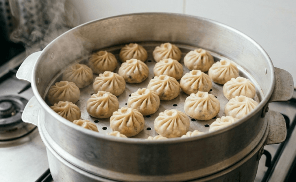 Steaming gives MoMo their characteristic soft, slightly translucent texture.